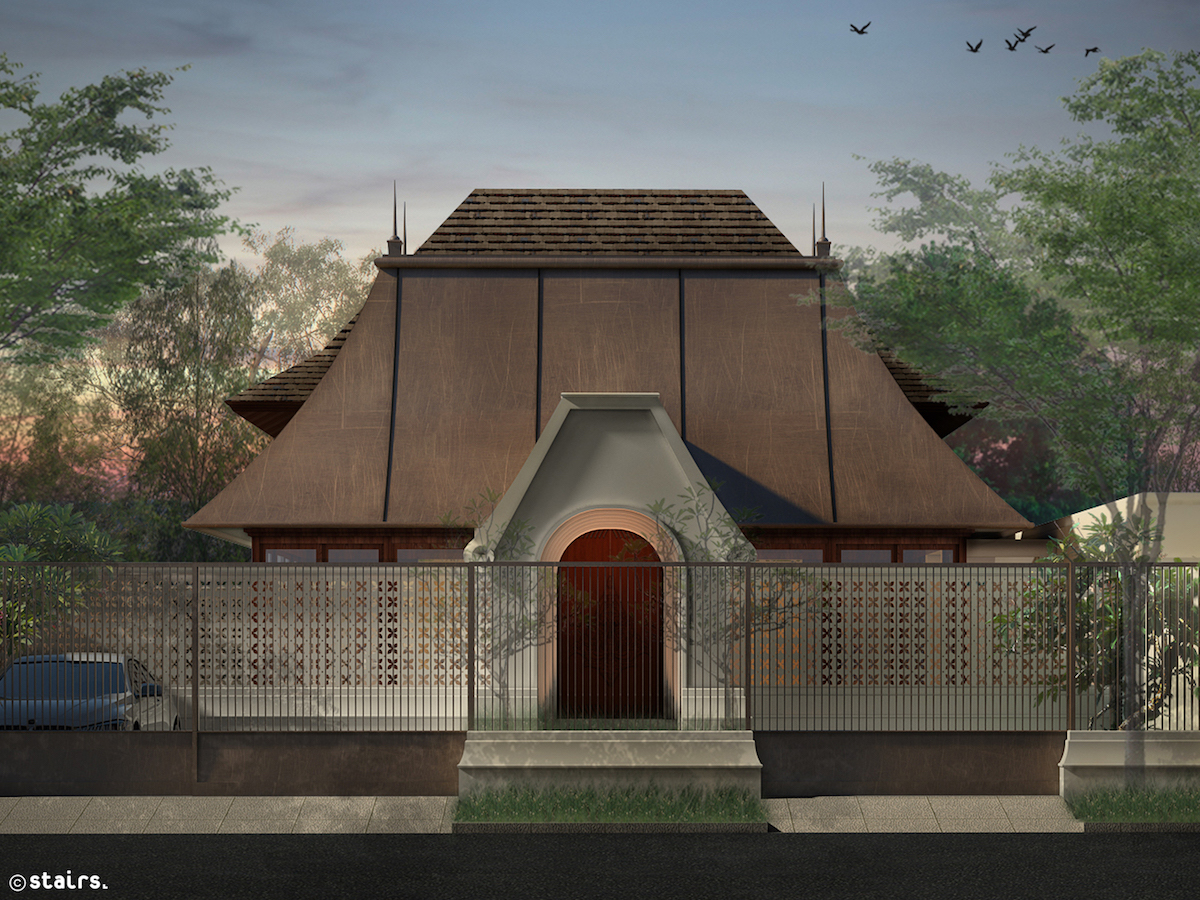 A side from green elements, our design is strongly related to cultural lifestyle. A strong impact of traditional roof stands out as facade, collaborate with breathing wall in the front side. A centered entrance implied a well-balanced feel and sense of space that become one of our principle. Consists of two level, one floor on the front side, then two floors in the back side. First front level is used as living room that borderless with the dining area.