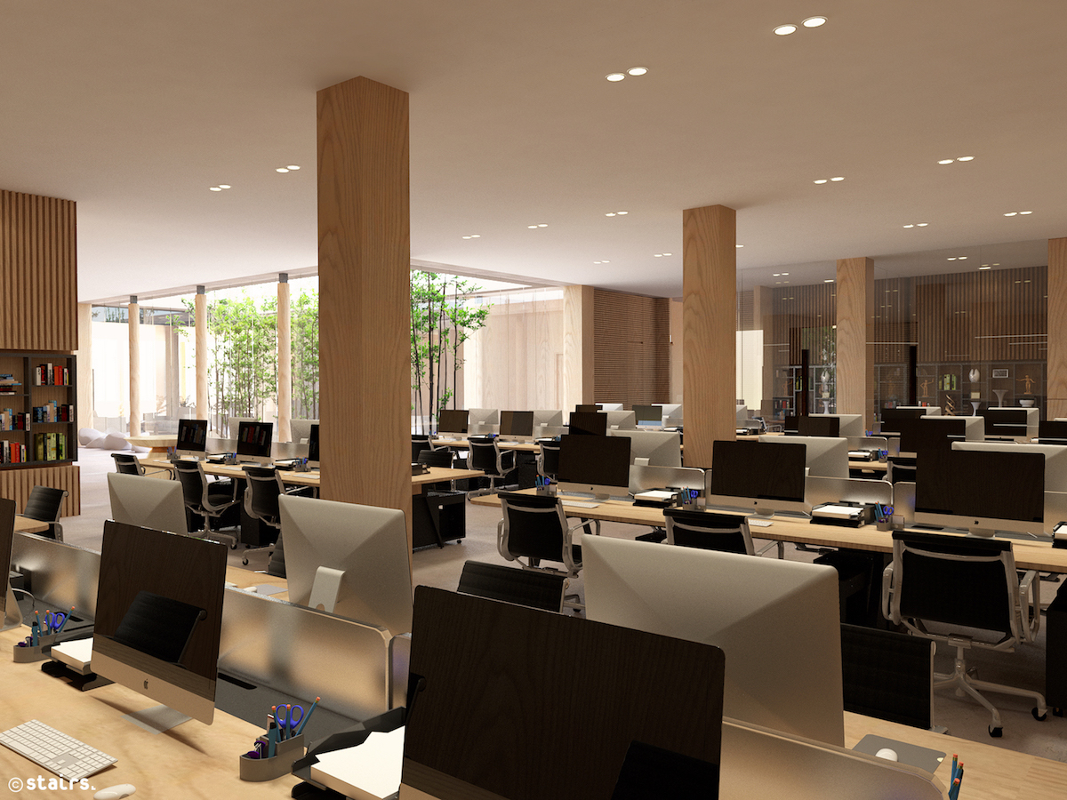 The facade of the showroom designed with canted vertical stainless steel plates collaborate with glass, subtly invokes a material common to the industrial activity taking place at the other end of the site, at the same time, it mirrors the image of the constantly changing patterns and colors of the sky.