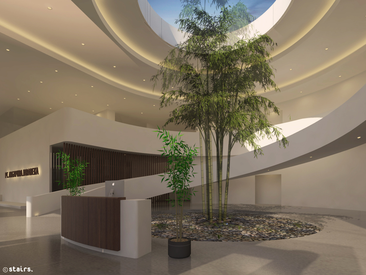 Consist of 2 levels, the first one is used for atrium, meeting room, laboratory, training room, production, sport hall, and parking. Meanwhile the next level is used for gallery, lounge, auditorium, meeting room that separate with production area in the back side.